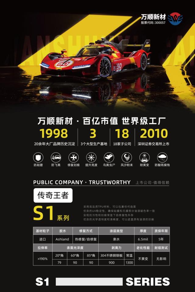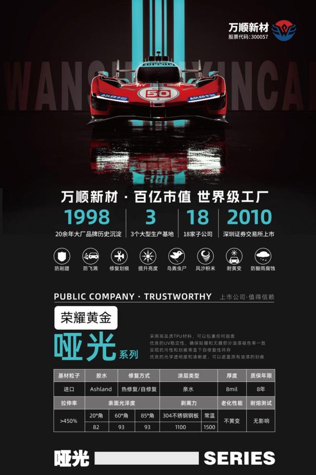 万顺新材隐形车衣**新是12款产品系列。全新发布爆款产品T系列(T1,T2,T3) 高端的W系列(W1,W2,W3,W4),高性价比系列(S1,S2,S3)哑光款和亮黑款,全矩阵产品线覆盖,符合不同人群和预算的车主。