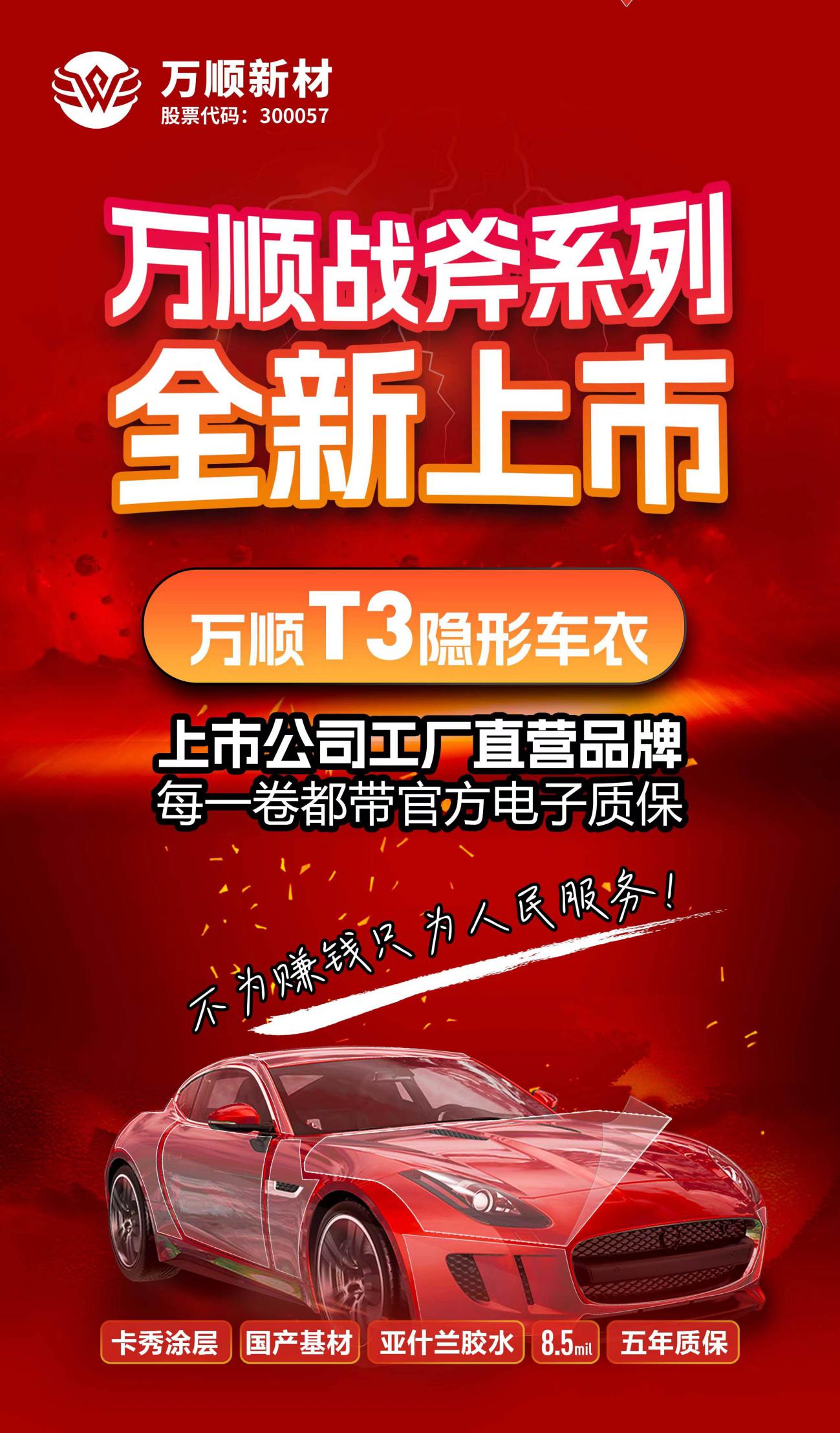万顺新材2024年初再次携手王炸级产品火爆全网,将隐形车衣的价格再次拉到冰点,推出全新的三款T系列产品,同样的“配方” 更尖端的工艺,加量不加价 享受更高的性价比。 万顺新材T系列就是属于“无脑”冲就完事了